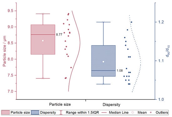 The p(GMA-co-EDMA) particle sizes varied between 7.41–9.38 µm and particles of all batches showed a monodisperse distribution with a d90/d10 range between 1.04 and 1.20 (CV% max. 15.8%), see Figure 1. No statistically significant effects of the factors on the dispersity were found. The median d90/d10 is 1.08. This is in accordance with the finding that the dispersity of the seed particle is crucial for the dispersity of the product [38].