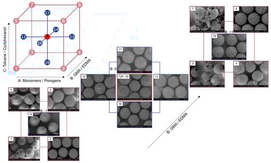 SEM images with 10,000 magnification of each particle batch numbered by standard order. The design cube is divided according to the level of factor B: GMA:EDMA ratio. Factorial points are numbered according to the standard order given in Table 2 and are displayed burgundy, central point is displayed red and axial points are displayed blue.