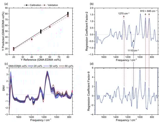 PLSR with nine factors for GMA:EDMA ratio based on FTIR spectra. (a) shows the predicted vs. reference of GMA:EDMA ratio for calibration (■) and validation (●). The SNV pre-treated spectra of GMA:EDMA ratio of 20 vol% (dark blue), 50 vol% (light blue) and 80 vol% (red) are displayed in (c). (b,d) show the regression coefficients for factor two (highest explained variance) and factor nine (model regression coefficient) and influential frequencies are highlighted.