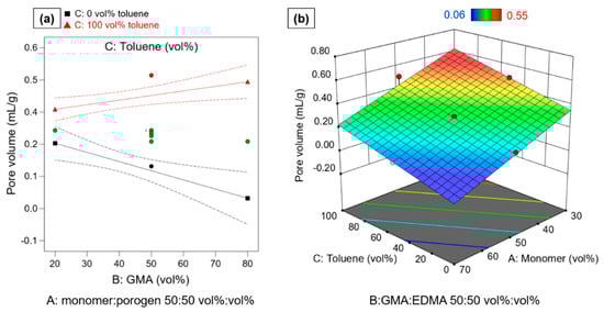 However, Figure 3 and Equation (7) show that not only the monomer:porogen ratio influences the pore volume, but also the composition of the porogen mixture and its synergistic interaction with the GMA:EDMA ratio. The porogen composition was examined in a range of 0/100 v/v ratio of toluene:cyclohexanol to a ratio of 100/0 v/v of toluene:cyclohexanol.
