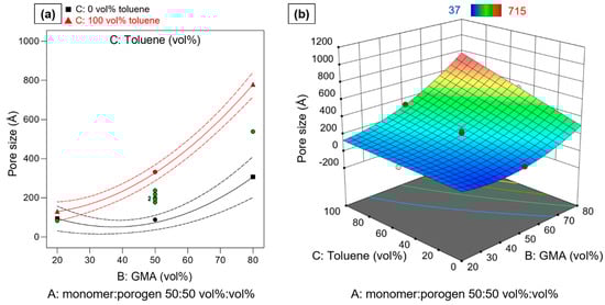 (a) Interaction plot of the synergistic interaction between GMA:EDMA*toluene:cyclohexanol at medium level of factor monomer:porogen ratio. Red triangles indicate measured pore size at high toluene content. Black squares indicate measure particle size at 0 vol% toluene (100 vol% cyclohexanol). Green circles indicate measured particle size at medium toluene level. Dashed lines indicate 95% confidential intervals. (b) Shows response surface of pore size in dependence of factors B and C at high level of A. Blue areas correspond to low pore sizes, red areas correspond to high pore sizes.