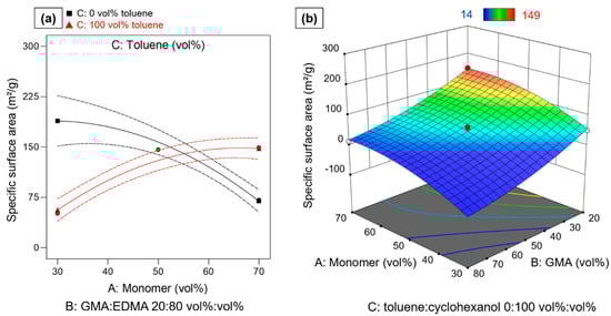 The specific surface area is a function of the two previously discussed properties pore volume and pore size. Data analysis was again performed via an ANOVA which is given in Table 6. Of the linear terms, only B, the GMA:EDMA ratio is statistically significant by itself. The other linear terms are A: monomer:porogen and C: toluene:cyclohexanol were added to preserve model hierarchy, since they are involved in the significant interaction term AC. However, the non-linear effects A2 and B2 are highly statistically significant. Although the specific surface area is deducted from the pore volume and the respective pore size, a different combination of factor effects is statistically significant and required for model building. While the linear terms A and C were highly statistically significant for the other two parameters, these are only hierarchical in the model for the specific surface area. The interaction AC, on the other hand, was not relevant for any of the other responses. This shows that the relationship of the specific surface area and the process factors is highly complex and not predictable in a simple way. The relative impact of each process factor on the specific surface area can be seen in Equation (9) in terms of coded factors: