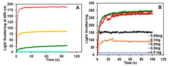 In the second set, the light scattering of different concentrations of 0.05, 0.1, 0.2, 0.5, and 1.0 mg/mL treated with 0.2 mM of SY dye was measured against time in seconds.
