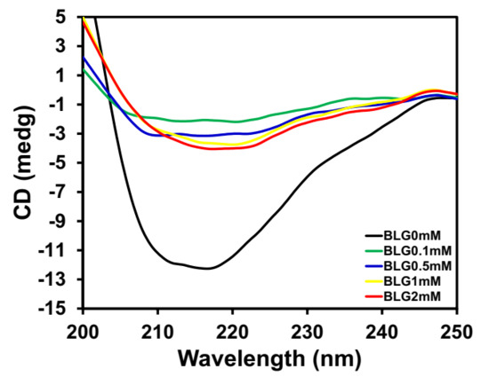 CD spectroscopy is a useful spectroscopic technique usually used to investigate proteins’ secondary structural changes. The protein secondary and tertiary structure can be modified by binding to the small molecules or ligands and sometimes by perturbing the structures of proteins. Far UV-CD measurements were performed with and without the SY and characterized the modification of the secondary structure of BLG. The far-UV spectra of BLG with and without SY were shown in Figure 5. The figure noted that the CD spectrum of native BLG exhibited a broad negative minimum in between 210–220 nm, which is consistent with the other published report, indicating that BLG has a β-sheet structure [33]. When BLG samples were incubated with different concentrations of SY dye (0.1, 0.5, 1.0, and 2.0 mM), a huge decrease in negative ellipticity was recorded without the shift of peak position, which is indicative of a loss of secondary structure. The reduction in negative ellipticity without the peak position shift indicates that the BLG molecules lost the secondary structure in the presence of SY dye. The aggregation caused by SY dye also suggests that the BLG aggregates do not have any ordered secondary structure. It could be a signature of amorphous aggregates. The percent secondary structure changes of BLG in response to SY dye was shown in Table 2.