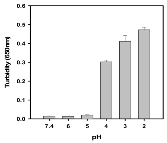 The change in turbidity of SY-induced BLG aggregates was tested and shown in Figure 7. From the figure, it was observed that the turbidity was not seen up to pH 5.0, but below pH 5.0, a progressive increase in turbidity was seen and maximum turbidity was recorded at pH 2.0. The possible cause of the increase in turbidity is due to BLG aggregation. The isoelectric point of BLG is reported at around 5.2, and below pH 5.2, the BLG will be positively charged and have sufficient affinity to interact with the negatively charged sulphate of SY dye.