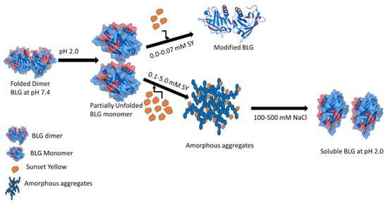 Herein, we assessed the effect of SY on BLG aggregation at acidic pH and tried to propose the mechanism of SY action. Until now, BLG aggregation in the presence of the food dye “SY” has not been discussed. We have tried to characterize the nature of BLG aggregates formed in the presence of SY dye. The effect of salt on the BLG aggregation pathway was also elaborated. Turbidity and Rayleigh light scattering, far-UV CD, and transmission electron microscopy (TEM) were used to characterize the nature of SY-induced aggregation. The results of this work will provide a complete understanding of SY-induced BLG aggregation. This work will also provide the method to induce aggregation in BLG protein and utilize the aggregates for food processing. Many proteins, such as milk, legume, egg, and cereal, form amorphous or amyloid fibril at different food processing conditions [30,31].