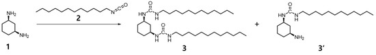 Compound 3 was prepared by a previously reported method [66]. Dodecylisocyanate (1.22 g, 5.7 mmol) was slowly added to a stirred solution of 1,3-cyclohexanediamine (0.3 g, 2.6 mmol) in toluene (30 mL). A gel-like precipitate was formed immediately. After stirring overnight, the crude product was collected by filtration as a white waxy solid. The product was purified by resuspending the waxy solid in dichloromethane (50 mL), stirring for 1 h, and collecting the product on a glass filter. This procedure was repeated when necessary. After drying at 60 °C under vacuum, the product was obtained as a white solid in 87% yield. The product was characterized by 1H NMR, FT-IR, and ESI-MS spectroscopy (Figures S1–S3). 1H NMR (500 MHz, DMSO-d6) δ 5.45 (s, 1H), 5.39 (d, J = 6.8 Hz, 1H), 3.39 (br, 2H), 3.06–2.98 (m, 4H), 2.04 (d, J = 12.2 Hz, 2H), 1.81 (d, J = 12.3 Hz, 2H), 1.70 (d, J = 14.1 Hz, 2H), 1.40 (s, 4H), 1.30 (d, J = 2.6 Hz, 32H). FT-IR (ATR): 3340, 3295, 2920, 2849, 1623, 1564, 1464, 1264, 1224, 722, 670, 636 cm−1. ESI-MS (m/z): Calculated for C32H64N4O2 [M + Na]+ 559.49, Found [M + NA]+ 559.50.