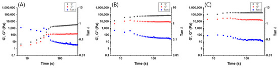 Time sweep (frequency = 0.6283 rad s−1) of gels obtained from (A) 1 (1 wt %) + 2 (2 equiv.), (B) 1 (3 wt %) + 2 (2 equiv.) and (C) 1 (5 wt %) + 2 (2 equiv.) in toluene.
