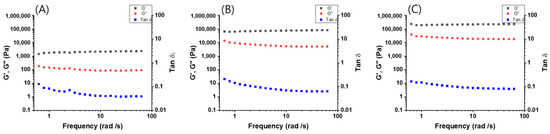 Frequency sweep of gels obtained from (A) 1 (1 wt %) + 2 (2 equiv.), (B) 1 (3 wt %) + 2 (2 equiv.) and (C) 1 (5 wt %) + 2 (2 equiv.) in toluene.