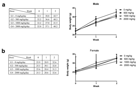 During the two-week observation period following a single oral administration of polyethylene microplastics, no specific clinical signs or significant changes in weight were observed in males or females (Figure 2a,b). At the end of the observation period, at necropsy, no changes from the administration of polyethylene microplastics were observed. Therefore, the lethal dose of polyethylene microplastics was determined to be more than 2000 mg/kg.