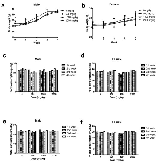 (a,b) Body weight of male and female mice measured once a week during 4 weeks following a repeated oral dose of polyethylene microplastics. (c,d) Food and (e,f) water consumption of male and female mice measured once a week during 4 weeks during a 28-day repeated oral dose toxicity study.