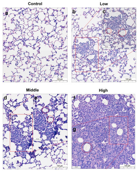 Lung histopathological evaluation of mice from 28-day repeated oral dose toxicity study. Lungs of male mice from (a) control group, (b,c) low-dose group, (d,e) mid-dose group, and (f,g) high-dose groups. Left picture represents low magnification, and right is magnified area of red box. Foreign bodies presumed to be polyethylene microplastics in alveolar space of lung (red circle). Scale bar = 100 μm, 50 μm.