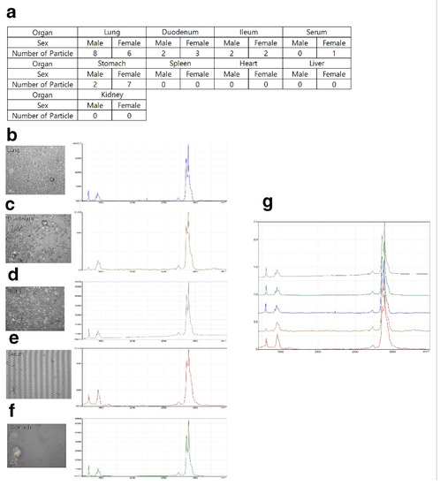 After pretreatment, the harvested organs were analyzed by Raman spectroscopy. No particles were observed in the low- and middle-dose groups (500 and 1000 mg/kg) (data not shown). A total of 14 particles in the lung (8 for males, 6 for females), 1 particle in the serum (1 for female), 9 particles in the stomach (2 for males, 7 for females), 5 particles in the duodenum (2 for males, 3 for females), and 4 particles in the ileum (2 for males, 2 for females) were observed in the high-dose group (2000 mg/kg) (Figure 6a–f). No particles were detected in the liver, spleen, kidney, or heart of the high-dose group.
