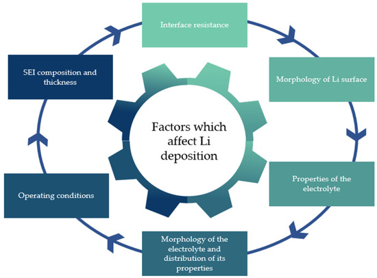 Li-ion batteries already dominate the market, from laptops and smartphones to electric vehicles [23,24], because of their ability to enable high-energy- and high-power-density-demanding applications. LIBs are normally formed by a cathode, a separator, an anode, and an electrolyte. The latter has a crucial role in the proper operation of the supply system since it serves as a medium for Li-ion movement between both electrodes. The electrolyte must be a good insulator so that all electrons can be conducted exclusively by the external circuit. If the electrolyte is damaged, insulation and safety can become compromised and electricity production becomes impossible. Thus, the operating environment, abuse tolerance (such as overcharging), and battery chemistry [25,26,27] require special attention, as these determine the safety and performance of electrolytes, and ultimately the performance of LIBs. Important factors that influence the electrochemistry of batteries (Li deposition in a LIB cell) are presented in Figure 2.