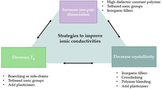 where is the pre-exponential factor, Ea is the energy activation, and T is the temperature. Equations (1) and (2) allow a better understanding of the key points to increase ionic conductivity. Although both mechanisms are correct, their predominance depends on the structure, temperature, and constituents of the system. Therefore, in both SPEs/GPEs, there are several aspects and strategies in common to improve the ionic conductivity of the employed polymer, which are briefly summarized in Figure 4.