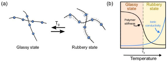 (a) Representative scheme of the behavior of the polymer related to the glass transition temperature and (b) interpretation of the relationship between the ionic conductivity and the polymer stiffness. Reprinted with permission from Gebert et al. [13]. Copyright 2021 Elsevier.