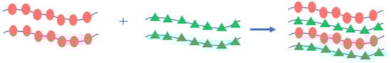 Other strategies have been investigated to target the decrease in crystallinity of SPE matrix, namely, polymer blending and crosslinking. These strategies will be discussed in detail in topic 4, although they will briefly be presented. Blending implies the mixture of two or more types of polymer chains without chemical bonding between them. This process demolishes the consistency of a single polymer chain, forming the desired amorphous polymer. For example, according to Tanaka et al. [11], the blending of PEO with poly(ethylene imine) (PEI) resulted in an ionic conductivity of ~10−4 S·cm−1 at 30 °C. A representative example of a blending polymer is presented in Figure 6.