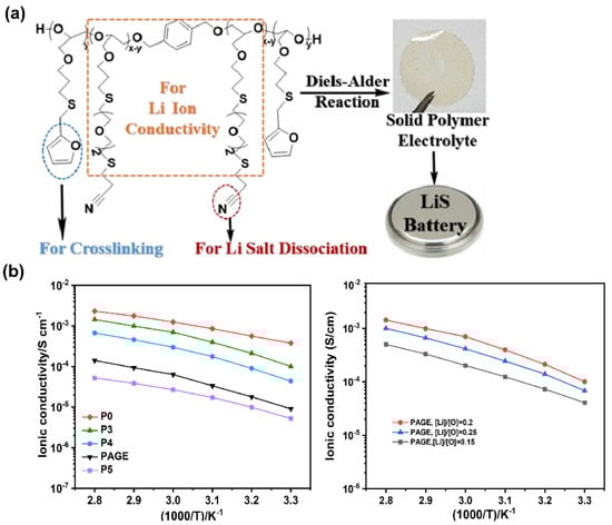 Moreover, new crosslinked structures based on poly(allyl glycidyl ether) PAGE copolymers with pendant nitrile (CN) and furfuryl mercaptan (FM) groups were developed to form an SPE with crosslinking sites via Diels–Alder reaction between the FM moieties in the presence of bismaleimide (Figure 9a) [86]. The highest value of 1.01 × 10−4 S·cm−1 of ionic conductivity at RT was attributed to the presence of CN groups, responsible for an effective Li+ dissociation, as well as the existence of a polyether backbone for Li+ migration. Different crosslinking ratios were studied to find the best compromise between ionic conductivity and mechanical strength, as crosslinking is known to increase the stiffness of a polymer. Results showed that the developed SPE with a 3% degree of crosslinking and a Li/O ratio of 0.2 showed superior ionic conductivity (Figure 9b), which inevitably decreased with the increasing number of crosslinking sites or Li–salt concentration, due to suppression of polymer chain mobility and the formation of aggregated species, respectively.