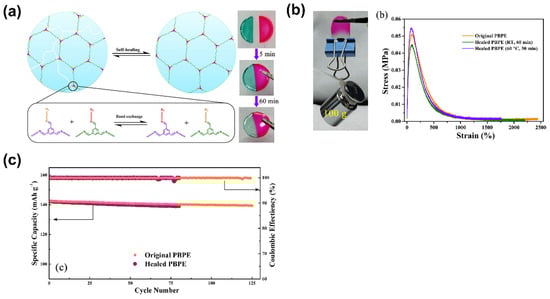 Regarding the safety and stability of the battery, self-healing materials can provide an effective alternative to deal with damage related to mechanical loads. Deng et al. [88] recently proposed a self-healing polymer based on cross-linkable poly(ethylene glycol) diamine (NH2-PEG-NH2) and benzene-1,3,5-tricarbaldehyde (BTA) dynamic imine bonds (Figure 10a). These reversible covalent bonds proved to be capable of healing within 1 h while retaining their stability. Interestingly, even with the addition of a plasticizer, the healed GPE was able to bear a weight of 100 g without tearing (Figure 10b left). Moreover, stress–strain experiments showed a recovery of almost all its mechanical properties after healing (Figure 10b right), which demonstrates an advantage of using this type of electrolyte in future applications. Along with these important properties, the developed GPE showed a superior ionic conductivity of 4.79 × 10−3 S·cm−1 at 30 °C (Figure 10c left), which are good mechanical properties. The assembled LPF cell displayed an excellent specific capacity of 118.2 mAh·g−1 (5 C rate) and 97.8% capacity retention after 125 cycles (Figure 10c).