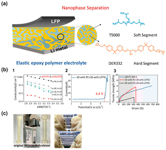 He et al. [83] prepared an SPE consisting of a difunctional block copolymer (DFBCP) prepared by sequential RAFT polymerization. Firstly, a polymer block containing acrylate moieties P(HOEA-co-MA) was synthesized by a reaction of methyl acrylate (MA) and 2-hydroxyethyl acrylate (HOEA). Subsequently, polymerization with PEG monomers followed by reaction with acryloyl chloride provided the desired DFBCP containing terminal cross-linkable vinyl bonds and ion solvation groups in separated blocks of the polymer. The final SPE was prepared by UV crosslinking with LiTFSI salt (Figure 7a) and showed improved ionic conductivity compared to traditional linear PEO or another block copolymer (BCP) SPEs (Figure 7b). This resulted from the mobile PEG chains, which allow faster ion solvation and a lower degree of crystallization, which were not confined by the crosslinking network due to being in different blocks of the copolymer. Enhanced mechanical performance was also achieved by the presence of the crosslinking sites.
