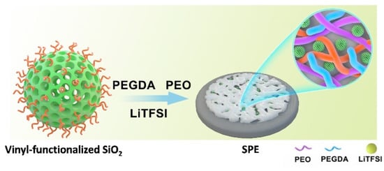 - Zhan, H.; Wu, M.; Wang, R.; Wu, S.; Li, H.; Tian, T.; Tang, H. Excellent Performances of Composite Polymer Electrolytes with Porous Vinyl-Functionalized SiO2 Nanoparticles for Lithium Metal Batteries. Polymers 2021, 13, 2468. [Google Scholar] [CrossRef]