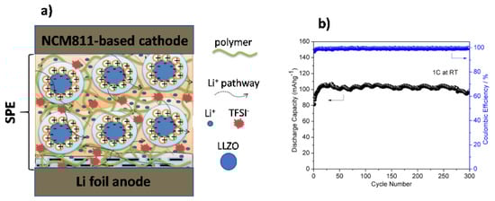 Different methodologies have been investigated to improve this property, including the modification and optimization of the polymer backbone, polymer blending, and filler incorporation (polymer compounding) [43,44,45,46,47,48]. Undoubtedly, the application of an SPE in a LIB can produce high-energy, -density, -safety, and -power devices [49,50,51]. However, the interactions on the polymer–metal ion interactions are affected by a wide possibility of factors, including distance and composition between functional groups, the nature of the functional groups that are attached to the polymer backbone, molecular weight distribution, and the degree of branching [40,52].