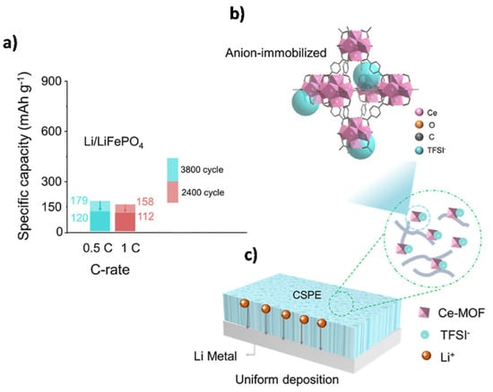 - Zhang, Z.; Huang, Y.; Li, C.; Li, X. Metal–Organic Framework-Supported Poly(ethylene oxide) Composite Gel Polymer Electrolytes for High-Performance Lithium/Sodium Metal Batteries. ACS Appl. Mater. Interfaces 2021, 13, 37262–37272. [Google Scholar] [CrossRef]
