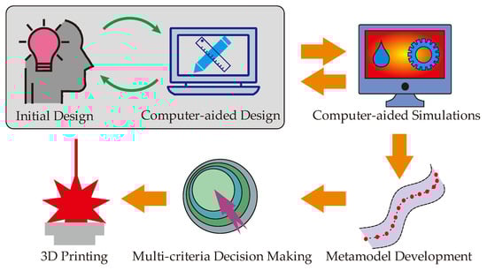 Computer-aided simulations are the next step after the design-related steps, and it is strongly suggested for efficient analysis of the developed CCCs in the mold. Since the CCCs have complex pathways that follow the curves of the plastic product, their thermal & mechanical analyses are not as easy as the straight-drilled channels so that analytical thermal & mechanical models or the established correlations, which are feasible for straight-drilled channels in the manufacturing industry, are not applicable. To overcome these challenges, computer-aided simulations allow us a better understanding of thermal and mechanical performances before printing the product via MAM machines. Since the simulations are done in a computational environment, it is easy to re-design and re-simulate before finalizing the product design. Orange arrows in Figure 1 deduce the second feedback mechanism in the entire process. Once the desired thermal & mechanical performance data is obtained, the next step becomes the metamodel development.