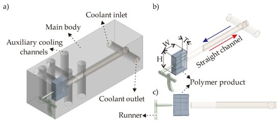 Design of the straight-drilled cooling channel: (a) isometric view of the whole body; (b) isometric view of the straight channel, polymer product, and runner; and (c) side view of the straight channel, polymer product and runner.
