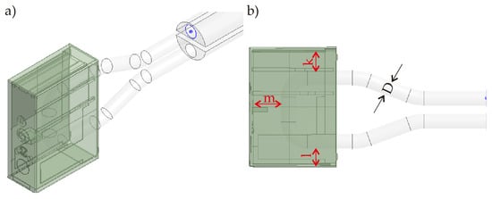 Computational simulations are performed using the main mold body shown in Figure 2a. However, the main focus is the conformal cooling-related parts that are explained in detail in Figure 3, Figure 4 and Figure 5. The current process is a three-dimensional (3D) transient heat transfer process so that the solution of mass, momentum, and energy equations must be clarified as presented in Equations (1)–(3), respectively,