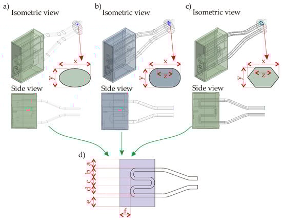 All cross-sectional profiles of the serpentine CCC designs are defined with dimensions and as shown in Figure 4. In this study, and values are defined as 2.5 and 1.5 mm, respectively. That is to say, the value (Figure 4) is the same as the value of the circular channel (Figure 3), but value (Figure 4) is smaller. Since the value is smaller than the value of the circular channel, the channel length is able to be designed as a serpentine type without exceeding the printability limits of the existing MAM machine. However, the smaller value may negatively affect the thermal performance so that the computational simulations will particularly point out this concern. Moreover, the elongated and the triangular types have an additional dimension, dimension , with the value of 1 mm in Figure 4. Besides, Figure 4d shows various distances of the serpentine channel. Thanks to more flexibilities in the printing process, the distance between the CCC and the frontal surface of the polymer part, dimension , is 3.5 mm that is smaller than the corresponding distance in the circular CCC (distance , Figure 3). The smaller distance can bring positive (shorter cooling time) and negative (higher temperature non-uniformity) during the cooling process so that the results will be discussed in the following sections. The distances – are 3.5 mm for serpentine CCC types.