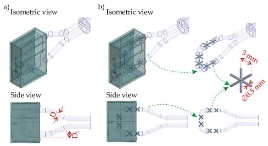 The tapered CCC is presented in Figure 5a. The initial diameter value, , has a similar range with the value of the circular CCC, between 2.1 and 2.5 mm. Then, the diameter is increased to value that has a range of 3.0–4.0 mm. By means of the increment, we aim to better manage the pressure drop in the CCC while achieving a shorter cooling time and more uniform temperature distribution. Furthermore, we consider further performance enhancement options like integrating lattice structures in the CCC as the MAM process allows us to create additional flexibilities. As shown in Figure 5b, six body-centered cubic (BCC) lattice structures are added to the channel. Hereby, the lateral surfaces of the BCC lattices will improve the heat transfer via convection and have the potential to achieve a shorter cooling time. On the other hand, the BCC lattices will behave like barriers against the coolant flow, which may result in pressure drop increments. To better understand the thermal performances of the proposed designs, computational models are presented in the next section.