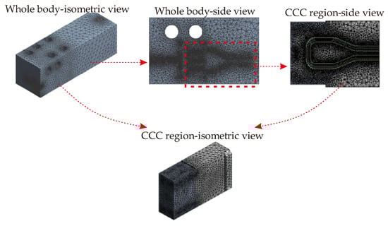 where , , and are the density, heat capacity, and thermal conductivity of the mold body. After defining the governing equations required for solutions of the computational model, the meshing process is completed via tetrahedral mesh that minimizes the number of mesh compared to other types. The mesh view of the solution model is shown in Figure 6.