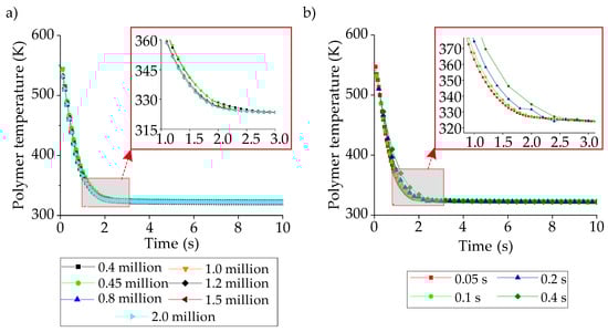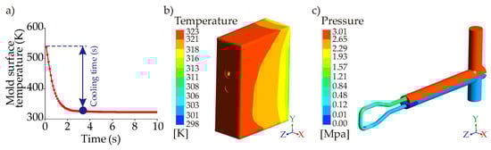 The thermal model aims to measure three objectives that are (i) cooling time, (ii) temperature non-uniformity, and (iii) pressure drop. Using the computational simulations, the cooling time is determined as the time from the injection temperature (543 K) to the ejection temperature (323 K). The temperature non-uniformity is the standard deviation of the plastic temperature as the surface as defined in Equations (5) and (6) below,