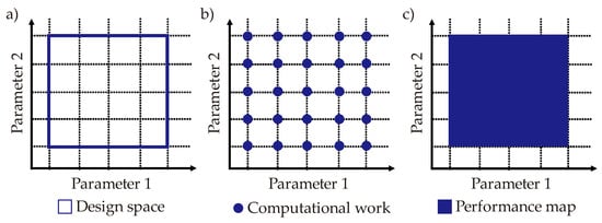 Illustrations of the metamodel development; (a) design space, (b) computational simulations, and (c) performance map.