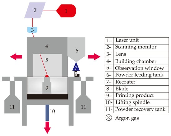 The metal additive manufacturing process is performed using the Direct Metal Laser Sintering (DMLS) approach that is one of the most economically feasible MAM techniques thanks to its benefits like stable manufacturing environment, smaller building platform that reduces the metal powder waste, and smaller average powder size that achieves the printability of smaller geometric feature size. The DMLS uses the focused laser beam in order to melt the micron-sized metallic powders, which is maraging steel MS1 powder in this work. Chemical and mechanical properties of MS1 powder are obtained by manufacturer dataset and shared in Table 1. DMLS provides layer-by-layer laser scanning; hereby, the stack of two dimensional (2D) layers form the 3D product. The DMLS process is employed with the commercial M100 (EOS GmbH) machine that consists of the laser system, building module, and powder collection system (for unmelted powders). The simplified schematic of the DMLS process is projected in Figure 9.