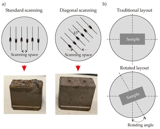 DMLS process parameters; (a) scanning method and (b) sample layout.
