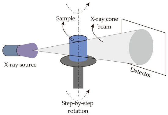 The MAM process quality is monitored using the X-ray Computed Tomography (X-ray CT) approach. As the CCCs are inside of the metal printed body, X-ray CT provides an effective and reliable scanning environment in order to measure the dimensions of the printed CCCs (e.g.; MAM process of microchannels in aluminum printing [31]). X-ray CT is a non-destructive (NDT) technique that can be summarized as (i) emitting a cone-beam of X-rays through the printing sample, (ii) generating projections based on the intensity of X-rays falling on the detector, (iii) calculating 2D CT images from projections, and (iv) stacking multiple 2D CT images into the 3D ones. The principle of the X-ray CT measurement is shown in Figure 12.