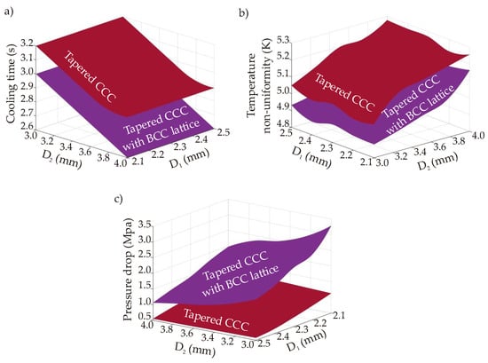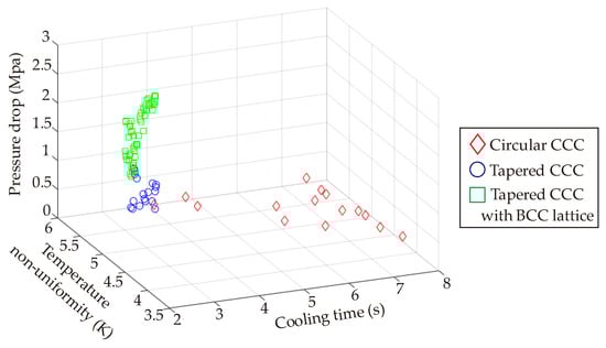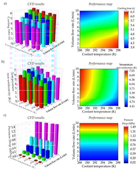 Results of the computational simulations and metamodels (performance maps) are evaluated according to the main objectives that are the cooling time, temperature non-uniformity, and pressure drop. Figure 13 represents the results of a case of a circular channel for three different objectives.