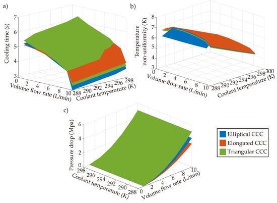 Serpentine CCCs are designed to provide smaller temperature non-uniformity with shorter cooling time compared to the circular CCCs. Figure 15 presents the performance maps of the serpentine channels according to the cooling time, temperature non-uniformity, and pressure drop. All serpentine CCC types show similar trends in the design space. Like the circular CCCs, the minimum cooling time is seen at the coolant temperature of 288 K and the volume flow rate of 10 L/min. Amongst others, the elliptic CCC has the shortest cooling time with 2.9 s; followed by triangular CCC with 3.2 s and elongated CCC with 3.4 s. The maximum cooling time is 6.0 s, 6.1 s, and 6.3 s for the elliptic CCC, elongated CCC, and triangular CCC, respectively, at the coolant temperature of 298 K and the volume flow rate of 10 L/min. Between the minimum and maximum values, the elliptic CCC has the minimum cooling time variation and it is followed by the elongated CCC and triangular CCC. Similarly, the minimum variation between the minimum and maximum temperature non-uniformity values belongs to the elliptic CCC and it is followed by the triangular CCC and elongated CCC. Also, the minimum temperature non-uniformity is seen for the elliptic CCC with the temperature non-uniformity value of 3.77 K. For the elongated CCC and the triangular CCC, the minimum temperature non-uniformity values are 5.08 K and 4.99 K, respectively. This shows that there is a significant difference between the minimum temperature non-uniformity values of different serpentine CCCs. The whole CFD results of the serpentine CCCs are shown in Table A2.