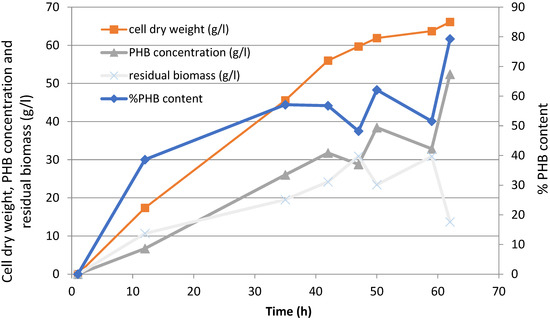 The cultivation of Ralstonia eutropha ATCC 17,699 with glycerol as a sole carbon source in order to obtain a PHB polymer yielded the following results as shown in Figure 3. Inoculated at 2.5 L for a period of 62 h under fed-batch cultivation, the cell dry weight increased up to 68 g/L. During the feasting period of 35 h onwards, it was found that PHB was rapidly accumulated within the cells, whereas the PHB concentration was higher and residual biomass tended to be lower. PHB content increased up to 82% at the end of fermentation. Table 3 summarized the fermentation results corresponding to the PHB production rate, and the PHB productivity can be calculated at 0.8 g/L/h.