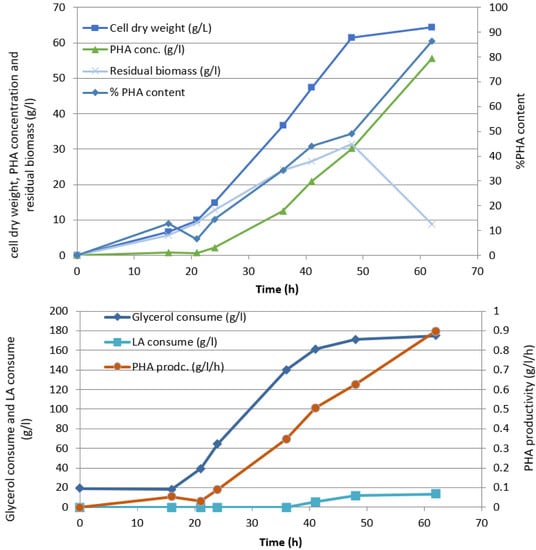 On the other hand, fed-batch fermentation of Ralstonia eutropha ATCC 17,699 was performed in a 5 L bioreactor containing 2.5 L mineral solution supplemented with a carbon source of glycerol:levulinic acid cosubstrates at a ratio of 7:3 as precursors of 3HB, 3HV and 4HV monomer unit. The cultivation of PHBVV copolyester was obtained as shown in Figure 4, providing that at the period of 20–35 and 42–62 h the cell growth rate and the PHA concentration increased dramatically to 64 g/L and 55 g/L, respectively. During the 40-h cultivation period onwards, there was a rapid accumulation of PHA within the cells giving rise to the concentration of PHA being higher and the residual biomass tended to be lower. The PHA content increased as high as 83% at the end of fermentation harvested at 62 h. We found that the rate of cell production in the bioreactor tended to increase over time relating to PHBVV biosynthesis. In addition, the graph shows that levulinic acid was applied at approximately 40 h, which is the PHA accumulation period resulting in the PHA productivity increased up to 0.9 g/L/h.