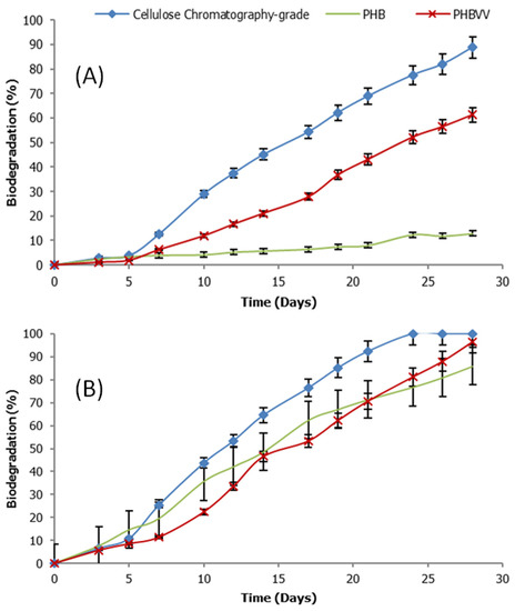 Biodegradation of PHB and PHBVV samples compared to cellulose reference sample in natural seawater (A) and synthetic seawater (B).