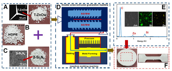 Experimental materials and fabrication: (A) tetra-needle-like ZnO particles (T-ZnOw); (B) high-density polyethylene particle (HDPE); (C) Si3N4 nanoparticle; (D) double screw extrusion granulation and injection molding machines; (E) the EDS curve and element distribution maps of HDPE composite with 6 wt% Si3N4 addition; and (F) the samples fabricated for friction and mechanical tests.