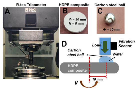 The friction experiments were conducted using a commercial ball-on-pin friction testing machine, as shown in Figure 2A (R-tec Tribo-meter, Rtec instruments Inc., San Jose, CA, USA). A 10 mm diameter carbon steel ball, which is an extensively used engineering frictional metal material, was selected as the frictional pair (Figure 2C). The HDPE specimen had a cylindrical shape with a diameter of 30 mm and a height of 8 mm (Figure 2B). During the tribological experiment, the carbon steel ball was maintained in a stationary position at the top, while the lower HDPE specimens were rotated at a velocity of 0.021 m/s (Figure 2D). The vertical load was 80 N and the radius of rotation was set to 10 mm. Additionally, a vibration sensor was fixed on the upper fixture to measure the vibration induced in the HDPE-based composites during the wear and friction process (also shown in Figure 2D). The aqueous environment was simulated by continuously adding distilled water between the frictional interfaces during the experiments to ensure sufficient water availability. The experiments were conducted for 1800 s and the test data were recorded at an interval of 0.001 s. A new polymer plate and carbon steel ball were used for each experiment. In addition, all the tests in this study were repeated thrice to ensure repeatability.