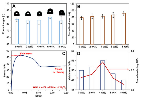 Properties of the modified HDPE composites: (A) the contact angle with distilled water; (B) the shore hardness; (C) the strain–stress curve of the HDPE composite with 8 wt% Si3N4 addition; and (D) the yield stress and strain hardening of modified HDPE composites.