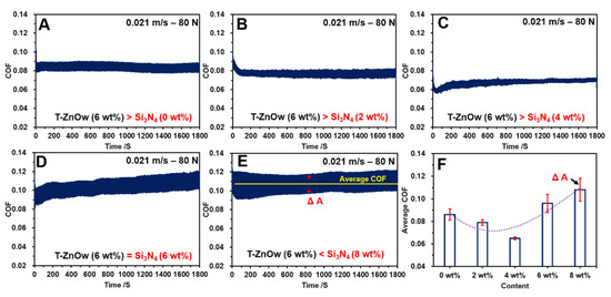 The COF results and the amplitudes of the modified HDPE composites with different Si3N4 concentrations: (A) 0 wt% Si3N4 addition; (B) 2 wt% Si3N4 addition; (C) 4 wt% Si3N4 addition; (D) 6 wt% Si3N4 addition; (E) 8 wt% Si3N4 addition; and (F) the average COF results and its amplitudes.