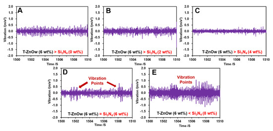 The friction-induced vibration responses of the modified HDPE composites with different contents of Si3N4 at 0.021 m/s and 80 N in a water-lubricated environment: (A) 0 wt% Si3N4 addition; (B) 2 wt% Si3N4 addition; (C) 4 wt% Si3N4 addition; (D) 6 wt% Si3N4 addition; and (E) 8 wt% Si3N4 addition.