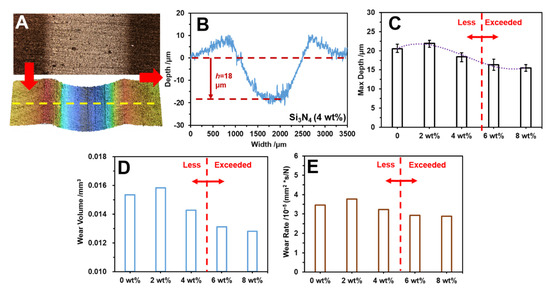 The wear rate behavior of HDPE composites with different concentrations of Si3N4 at 0.021 m/s and 80 N in an aqueous environment: (A) wear scratch and its 3D profile; (B) cross profiles of the wear scratch with 4 wt% Si3N4 addition in the composite; (C) the maximum depths of the modified HDPE composites; (D) the wear volumes of the modified HDPE composites; and (E) the wear rates of the modified HDPE composites.