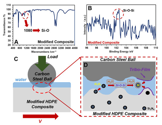 Mechanism of Si3N4 for the enhancement of lubrication: (A) infrared spectrometry; (B) diffraction of X-rays results of the worn surface with 4 wt% Si3N4 addition in the HDPE composite (C); and (D) are the lubricating mechanism of 4 wt% Si3N4 addition in the HDPE composite during friction.